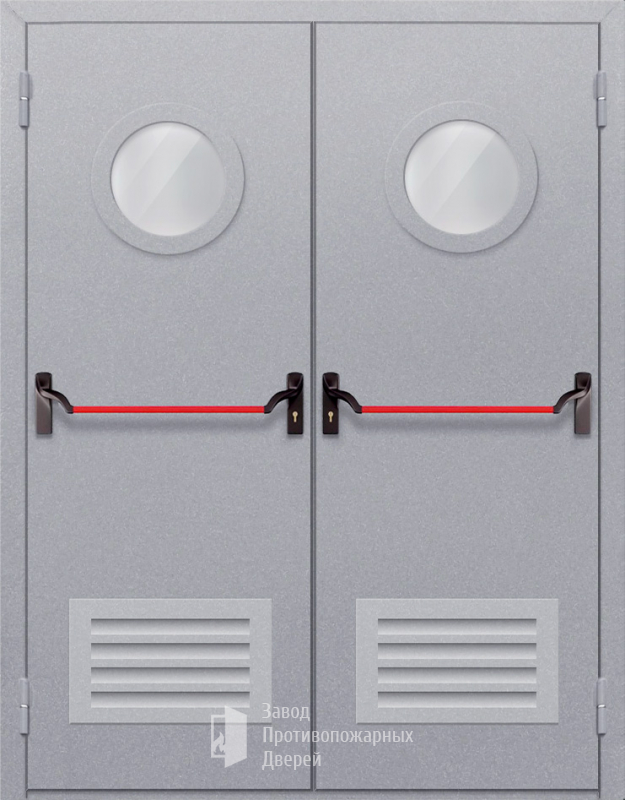 Противопожарная Двупольная дверь с круглым стеклом ДПМ-02-EIW60 с решеткой и антипаникой |